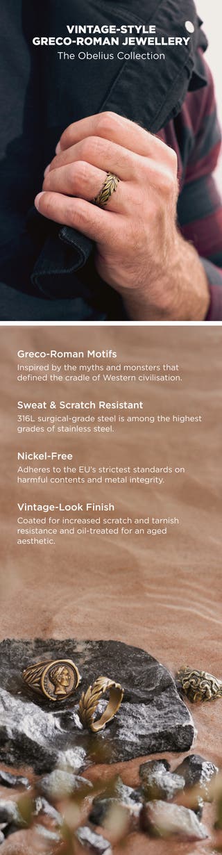 Its gold tone is accomplished with PVD coating, an ultra-thin layer of titanium nitride fused with the metal at the molecular level. It will neither fade nor flake and is scratch and tarnish resistant. Made of surgical-grade stainless steel, this men’s ring is oil treated for a distinctly vintage look. Every groove and detail is emphasized by the added contrast.