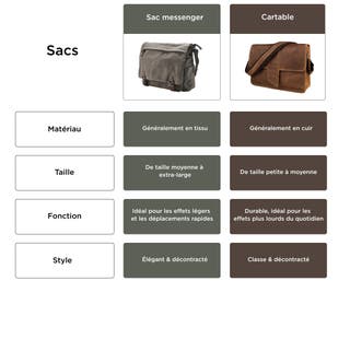 Si vous êtes à la recherche d'un modèle au look vintage et raffiné, la sacoche est faite pour vous. Pour un style plus moderne et décontracté, le sac messenger est le meilleur choix.