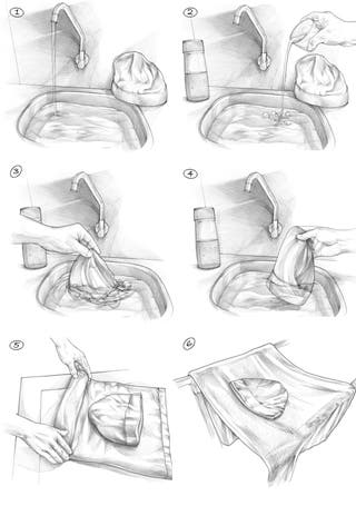 - Lorsque l'eau est claire, posez le bonnet sur une serviette sèche. Roulez doucement la serviette et appuyer fermement pour retirer l'excès d'eau. Ne la tordez ou ne la pliez pas.