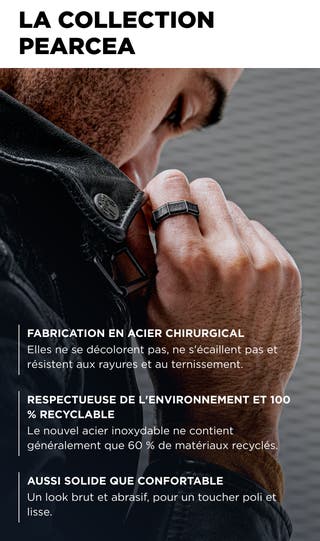 Cette bague est fabriquée en acier inoxydable 316L sans nickel et présente un extérieur facetté et texturé aux tons noirs et gris profonds. La surface géométrique a un aspect patiné à la main, tandis que l'intérieur est brossé et lisse pour créer un contraste net. Le résultat : une bague sculptée et moderne, à la fois robuste et raffinée.