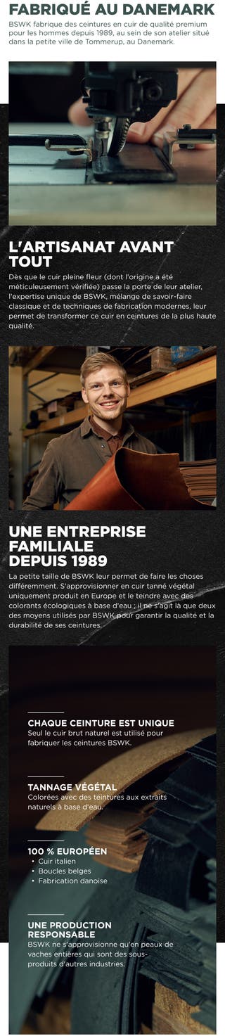 Fabriquée en véritable cuir italien de haute qualité à tannage végétal et assemblée au Danemark afin de l'équiper d'une boucle massive en métal très résistant, cette ceinture ne laissera aucune place au doute : il n'est pas question que l'on joue avec vos pieds.