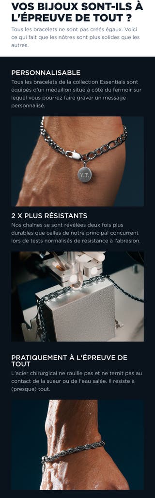 Portée seule, la chaîne discrète offre un rendu subtil et moderne. Elle se glisse facilement sous les manches de chemise et se marie bien avec une montre. Le ton argenté convient aux tenues décontractées comme aux tenues plus habillées, et la silhouette fine se superpose à d'autres bracelets sans ajouter d'épaisseur.