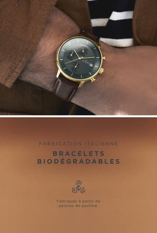 Des bracelets en cuir végan G-Pomme C, un similicuir de fabrication italienne biodégradable et respectueux de l'environnement et des animaux. Ce cuir est produit à partir d'épluchures de pommes (entre autres composés organiques) et il possède l'apparence, le toucher et la durabilité du cuir traditionnel. Il est par conséquent une excellente alternative au cuir animal.