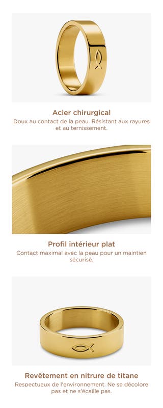 Fabriquée en acier inoxydable 316L, cette bague affiche une finition dorée chaude et un jonc plat et épuré. L'extérieur très poli est gravé d'un motif de poisson discret. L'intérieur brossé augmente le confort et le métal est sans nickel.