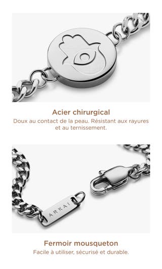 Le bracelet a une silhouette fine, discrète et raffinée au poignet. La pastille circulaire Hamsa crée un point focal sans volume, ce qui permet de le superposer à d'autres bracelets ou de le porter seul. La teinte acier polie convient aussi bien aux tenues décontractées qu'aux tenues plus habillées.